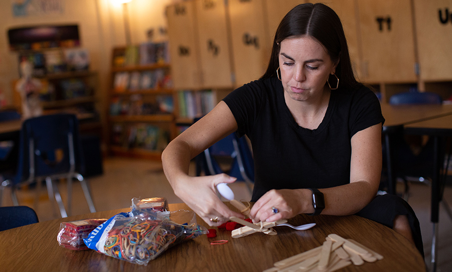 Bullard packed her STEM kits with an assortment of items from hot chocolate to balloons that would help her students learn about energy. When it was time for class, sitting in front of her laptop in an empty classroom, Bullard took supplies out of her kit while her students did the same at their homes. Together, they built a catapult with popsicle sticks, rubber bands and a plastic spoon to launch marshmallows into hot chocolate – a much more entertaining way to learn about forces of motion than a textbook.