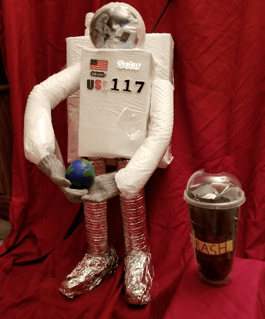 Using a cardboard box wrapped with white trash bags, the astronaut’s body came together. They added a swim noodle wrapped in a car sunshade for the arms and legs, with an old curtain rod for support. The astronaut’s feet are made of old shoes wrapped in tin foil, the helmet created from a fish bowl wrapped in a white trash bag, and the face mask made from a freeze-dried ice cream wrapper, appropriately known as “astronaut ice cream.”