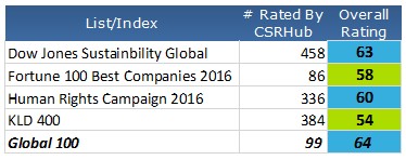 Each year our friends at Corporate Knights pull together a list of the 100 most sustainable corporations in the world. They base their assessment on an extensive analysis of the companies they study that includes a review of numerous facts and figures. CSRHub’s aggregation engine strives to determine a consensus of the perceived sustainability performance for the 17,000 companies we track by combining input from 500 different sources. It is satisfying to see that Corporate Knights’ more direct measurement and analysis approach aligns well with our methodology. Every one of the 100 companies on the Global 100 list had above average CSRHub ratings and the average overall rank was just below the 90th percentile.