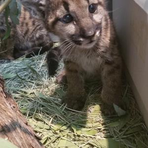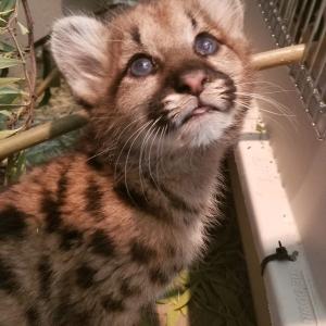 Captain Cal is one of three orphaned mountain lion cubs rescued from the wildfires and transported to the Oakland Zoo for care. At the time of rescue, the cub appeared to be 3-4 weeks old and weighed in at just over 3 ½ pounds. His whiskers were singed off and his paws were badly burned. The Oakland Zoo worked with the UC Davis Veterinary Medicine Teaching Hospital to treat his wounds.