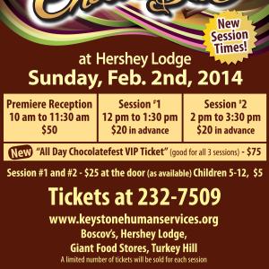 Tickets for Chocolatefest general sessions cost $20 in advance or $25 at the door, as available. Tickets for children ages 5-12 cost $5. Premiere tickets cost $50. Guests can also purchase an All-Day VIP ticket for $75 to attend all three sessions. Chocolatefest tickets can be purchased online, by phone at 717-232-7509, or at Boscov’s, Giant Food Stores, Hershey Lodge, and Turkey Hill Minit Markets.