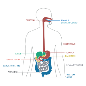 Digest this. The digestive or gastrointestinal tract is about nine meters or 30 feet long! It’s comprised of several key organs as well as accessory organs with more specialized functions. You may be surprised to discover that the majority of food digestion and absorption actually occurs in the small intestine and not the stomach. Explore images and interactive figures throughout the WELLography.