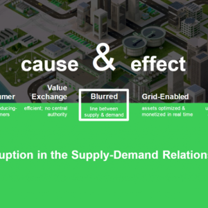 Technology innovation, business model innovation, the arrival of the producing consumer (i.e., “prosumer”) and decentralization are disrupting the relationship between utilities and their customers. The days of centralized generation with a one-way flow of electrons are fading, replaced by a model with a bi-directional flow of power — not only between utilities, organizations and individuals, but between organizations and individuals themselves. This is all possible due to burgeoning, efficient modes of value exchange such as peer-to-peer networks.