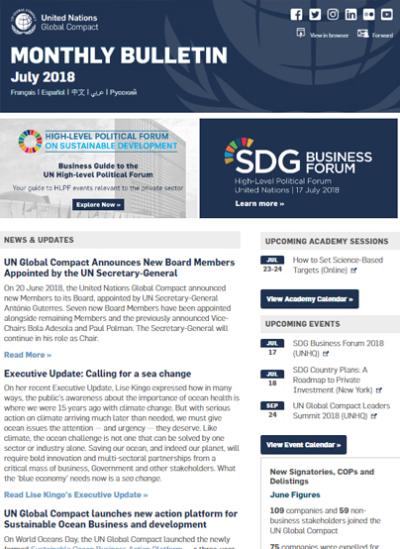The UN Global Compact Bulletin is designed to keep participants up to date on news, actions you can take, resources and events. Participants are encouraged to look to this monthly communication for important information. Please note that actions and events are intended for Global Compact stakeholders, unless otherwise indicated. The Bulletin is published in English, French, Spanish and Chinese.
