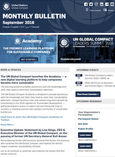 The UN Global Compact Bulletin is designed to keep participants up to date on news, actions you can take, resources and events. Participants are encouraged to look to this monthly communication for important information. Please note that actions and events are intended for Global Compact stakeholders, unless otherwise indicated. The Bulletin is published in English, French, Spanish and Chinese.