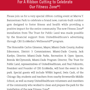 A ribbon-cutting celebration hosted by The Honorable Carlos Gimenez Mayor, Miami-Dade County, Audrey Edmonson District 3 Commissioner, Miami-Dade County, Jack Kardys Director, Miami-Dade Parks, Recreation & Open Spaces, Brenda McClymonds Miami-Dade Program Director, The Trust for Public Land, Igor Alonso, UnitedHealthcare Medicare & Retirement, and Paul Polizzotto, President and Founder of CBS EcoMedia Inc. Special guests included WNBA legend, two-time Gold Medal Olympic winner and founder of the Cash For Kids Foundation, Swin Cash of the Chicago Sky as well as many UnitedHealthcare volunteers and members of the community who worked to clean and prepare the park for the installation of the new Fitness Zone®