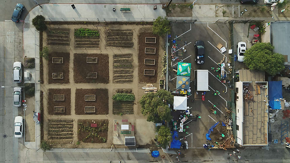 In November we headed west to Los Angeles for the third and final stop our tour. Close to 100 volunteers convened near downtown LA to transform a vacant lot into resident-driven urban farm to benefit the local homeless population. Volunteers demolished a shed and installed a new one, installed raised garden beds, constructed new garden benches, installed a compost system, created a pollinator garden, distributed mulch, planted over 1,500 seeds and twelve varieties of vegetables and wildflowers, installed solar lighting, birdhouses and more.