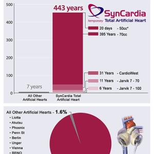 More than 1,400 implants of the SynCardia Total Artificial Heart account for over 400 patient years of life on the device. Since January 2010 more than 550 SynCardia Hearts have been implanted.
