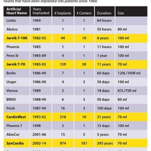 The SynCardia temporary Total Artificial Heart is the first and only FDA, Health Canada and CE mark approved Total Artificial Heart in the world. From 1969 through 2014 there have been 1,458 implants of 13 different artificial heart designs. The SynCardia Total Artificial Heart and its direct predecessors account for 1,397 or 96% of all implants.