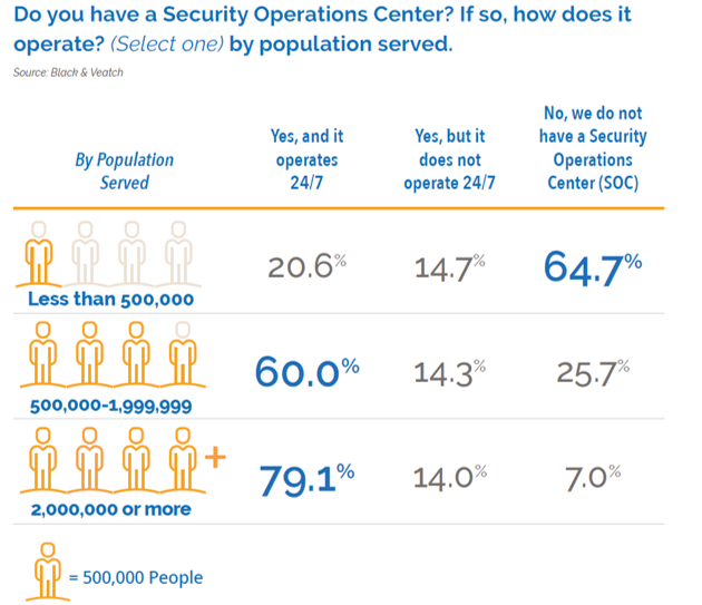 Utilities serving populations of more than 500,000 are overwhelmingly the ones with SOCs that work 24/7, perhaps because they’re better equipped to fund them, and they exist in areas where more qualified resources are available.