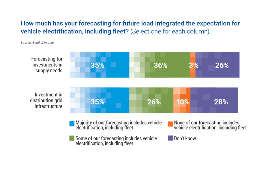 When asked how much their enterprise’s forecasting of future load included the expectation for vehicle electrification, nearly two-thirds of respondents said that they were either unsure, only included some forecasting or did not forecast for it at all. That included forecasting for investments in supply needs as well as in distribution grid infrastructure.