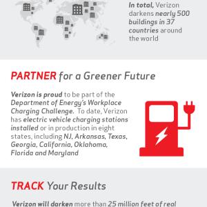 This year, Verizon will help spread global environmental awareness by dimming lights and illuminated signs at Verizon buildings located in the following countries: Australia, Austria, Belgium, Brazil, Canada, Chile, China, Colombia, Denmark, France, Germany, Greece, Hungary, India, Ireland, Italy, Japan, Luxembourg, Malaysia, Mexico, Netherlands, Norway, Panama, Peru, Philippines, Portugal, Puerto Rico, Russia, Singapore, Spain, Sweden, Switzerland, Taiwan, United Arab Emirates, United Kingdom, United States and Venezuela.