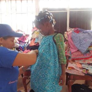 Enter Pedro Jiminez, HR manager at Timberland’s Dominican Republic factory, who recommended a worthy organization to receive the dresses – Centro Educativo Santa Teresa, a community center and school located near the sugar cane fields of La Higuera, El Seibo in the Dominican Republic. The challenge, however, was in the numbers – Timberland made 56 dresses at its sew-a-thon, but the center services 1,500 children including boys as well as girls. Not one to be discouraged, Timberland’s DAG Ambassador, Jackie Dewey, put the word out to local sewing groups near the company’s Stratham, NH headquarters, and collected more than 500 dresses, as well as other donated clothing for girls and shorts for boys. Timberland and Jackie also put out the word in Stratham, soliciting donations of gently used boys’ clothing, which generated even more items.