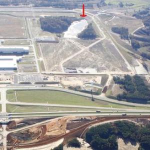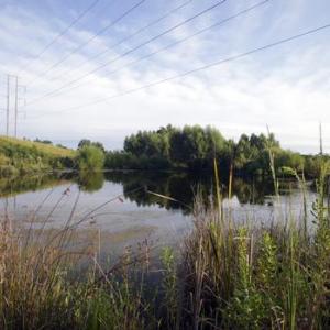 During construction of the plant, two retention ponds were established. The ponds are designed to capture and hold storm water runoff, allowing any suspended solids to settle. Water discharge from the pond is regulated with an 11-foot sluice gate and seven-foot concrete wall just beyond the gate. When the gate is raised, the water flows out through three slots in the wall.