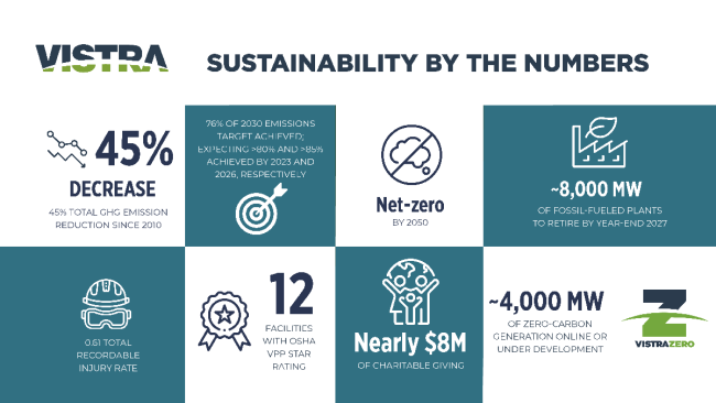 IRVING, Texas, May 13, 2021 /3BL Media/ — Vistra (NYSE: VST) today published its 2020 Sustainability Report, showcasing its commitment to all of its stakeholders and highlighting significant progress toward its sustainability goals. The report provides increased transparency on the company’s numerous environmental, social, and governance (ESG) initiatives.
