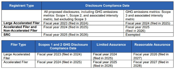 - Large, accelerated filers would begin filings to meet the rule requirements in 2024 for fiscal year 2023 GHG emissions for Scope 1 (direct) and Scope 2 (indirect) and associated intensity metrics. Other companies would have a year or two longer to comply –” (see table below for specific time periods for your company).