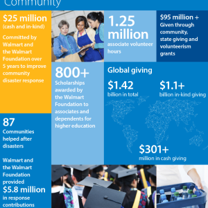 Walmart provides food, apparel and household products to hundreds of millions of customers in 28 countries around the world. We are committed to doing so in a way that creates economic opportunity for associates, suppliers and others in retail supply chains; enhances the environmental and social sustainability of supply chains; and strengthens local communities where we live and operate. For 10 years, we have been leading initiatives with our stakeholders in these arenas of opportunity, sustainability and community. We aspire to use our strengths to help others while also strengthening our business. Reshaping the systems we all rely on to help improve social, environmental and economic outcomes.