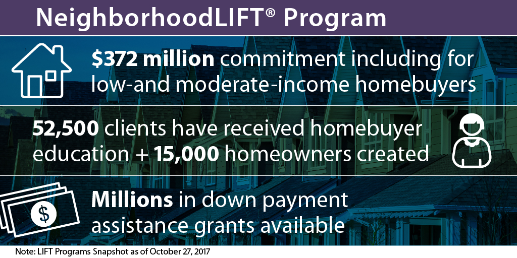 Wells Fargo has committed $372 million to support the revitalization of communities through LIFT programs in 57 communities across the U.S. That support has provided down payment assistance grants, financial education for more than 52,500 people, and homebuyer events for more than 33,600 people.