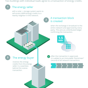 One of the most intriguing of such projects in the U.S. is LO3’s Brooklyn Microgrid (BMG), where residents with rooftop solar PV sell their excess energy to their neighbors, instead of relying on net metering to sell it back to their utility, ConEdison. Although the law prohibits energy consumers from selling energy to one another, BMG members are able to execute these peer-to-peer energy transactions using credits in a blockchain ledger. Every BMG prosumer connects to the microgrid through a dual-purpose meter called a TransActive Grid Element (TAG-e). The TAG-e both measures the participant’s energy production and consumption and communicates with other TAG-e devices to record transactions in the blockchain.