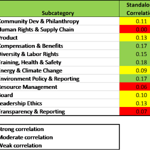 The ratings for each subcategory are forced into a curve that has a central tendency (around 50 on a scale from 0 = low to 100 = high). There is a natural tendency for subcategory scores to be correlated (i.e., a company who is good on one measure of sustainability tends to be better on all of the others), the correlation between subcategories is generally between 0.25 and 0.5 for subcategories that are in the same category (e.g., Energy & Climate Change vs Resource Management) and between 0.1 and 0.25 for subcategories that are in different categories (e.g., Product and Board).