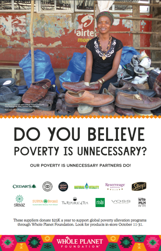 On October 25, Whole Foods Market will celebrate the 12th anniversary of Whole Planet Foundation, the company’s nonprofit dedicated to global poverty alleviation. Poverty is Unnecessary Day marks the launch of the foundation in 2005 to alleviate poverty around the world where the company sources products. Joining this effort are Poverty is Unnecessary Fund® partners, who collectively are committed to donating $300,000 this year.