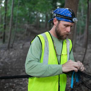 Researchers like Wilson set up nets that cover a small strip of a large sky and hope a bat flies into it. It looks like a volleyball net, but the material is made of a fine, black nylon that’s almost invisible at dusk. Wilson sits in a folding chair and walks to the net every 10 minutes from about 8 p.m. to 2 a.m. to see if he’s caught a bat.