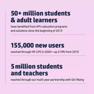 In the 2020 Sustainable Impact Report, HP reported some 50 million students and adult learners have benefited from HP’s education programs and solutions that advance quality learning and digital literacy, and enable better learning outcomes, since the beginning of 2015 (including nearly 21 million in 2020).