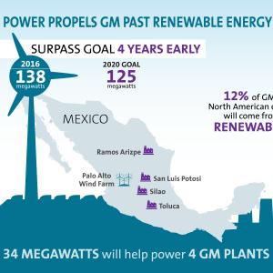 DETROIT, February 17, 2015 /3BL Media/ – General Motors for the first time is procuring wind to power its manufacturing operations, enabling one of its Mexico facilities’ electricity needs to be run mostly on renewable energy. This addition of 34 megawatts of wind power allows GM to achieve its corporate goal of renewable energy use four years early.