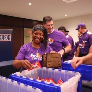 Through the FedEx Cares program, FedEx is committed to building strong local communities. This care package stuffing event is just one of the many ways FedEx supports service members and their families through the USO.