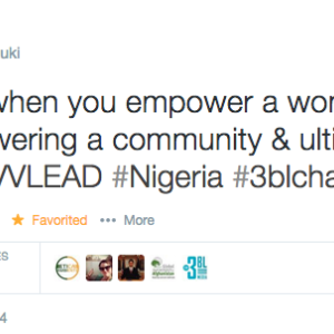 “Joy Eze ‘when you empower a woman, you are empowering a community & ultimately a nation.’ #VVLEAD #Nigeria #3blchat” (by @julie_muriuki) - https://twitter.com/julie_muriuki/status/504716588814454784