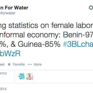 “Staggering statistics on female labor force stuck in informal economy: Benin-97%, Chad-95%, & Guinea-85% #3BLchat” (by @womenforwater) - https://twitter.com/womenforwater/status/504719176658079744