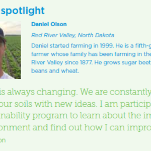 Nearly 80 percent of sugar beet fields in the Red River Valley grower engagement program have implemented some combination of conservation practices, such as cover crops, grass waterways, filter strips, field borders and contour strip cropping. These practices are helping improve the sustainability of beet sugar.