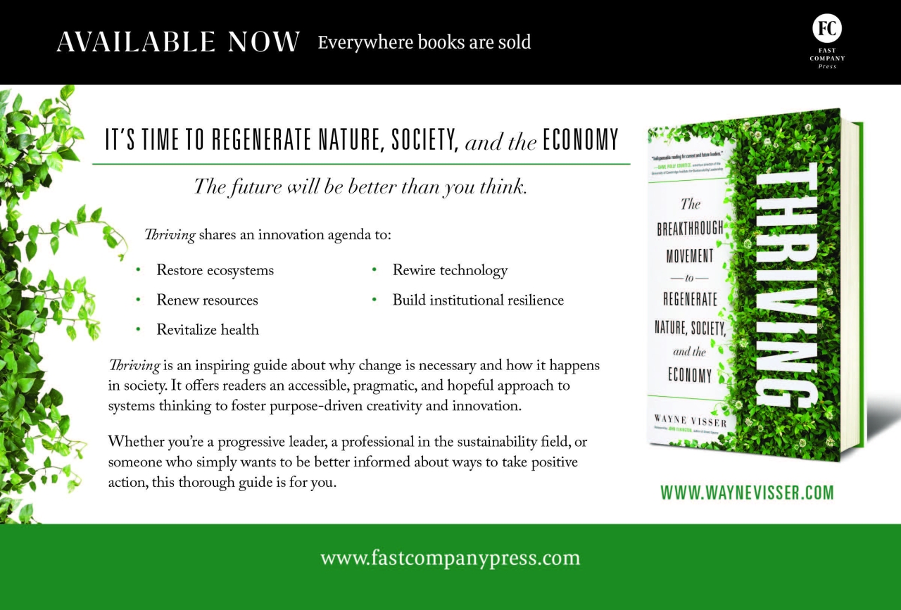 Paul Hawken, author of Regeneration: Ending the Climate Crisis in One Generation, calls Thriving “a brilliant and comprehensive overview of the burgeoning movement to regenerate our land, products, forests, cities, and society,” while Dame Polly Courtice, Emeritus Director of the University of Cambridge Institute for Sustainability Leadership calls it “indispensable reading for current and future leaders who must step up to deliver the business innovations, societal changes and ecosystem regeneration that we so urgently need.”