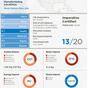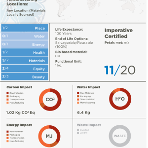 When fully certified, a Living Product is locally sourced with renewable or bio based materials, and is manufactured by processes powered only by renewable energy and within the water balance of the places they are made. Living Products should not endanger or impair the health of those who manufacture or use them, and should improve our quality of life and bring joy through their beauty and functionality. On the path to full certification, products can pursue Imperative certification by meeting at least seven of 20 Imperatives in the categories of Place, Water, Energy, Health, Materials, Equity and Beauty.