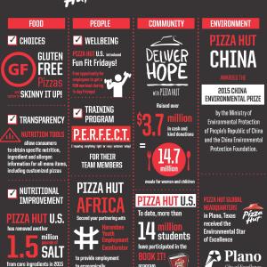 The report highlights the Company’s progress against its 2015 goals, elevated governance strategy to annually update the Yum! Board of Directors on its CSR commitments and progress, as well as a strengthened Supplier Code of Conduct and Human Rights & Labor Practices Policy. Also featured are success stories from the Company’s brands around the world presented in interactive, info-graphic-style and video formats.