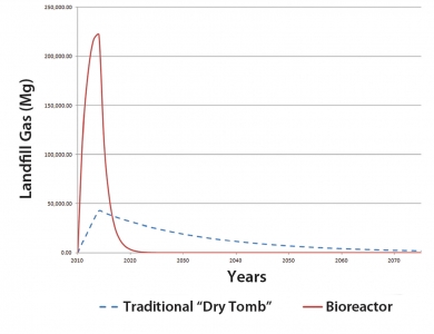 Critics of landfill gas projects sometimes decry such efforts, arguing that generating revenue from captured methane creates perverse incentives for landfill operators. One such incentive, they claim, is that landfill operators will artificially accelerate waste decay in order to increase methane production, and since gas collection systems don’t capture 100% of produced methane, this practice might actually lead to an increase in overall GHG emissions, at least in the near term (see graph).